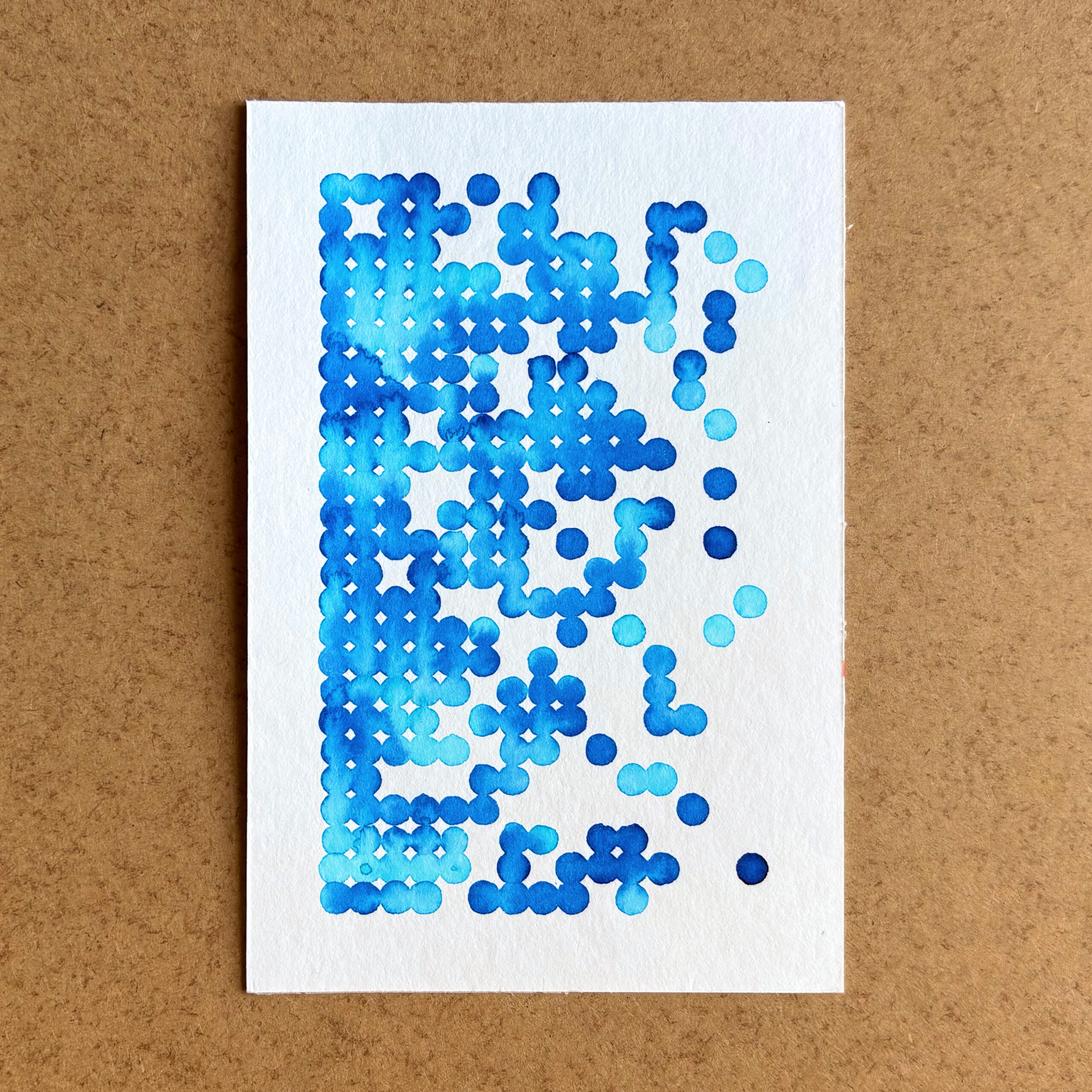 A watercolor take on the Amputecture series, executed with a brush mounted on the pen plotter. All dots are painted in order, line after line, while the ink is still wet, creating magical blends of color, and completing the randomness of the generated pattern with the unpredictibility of the paint behavior.