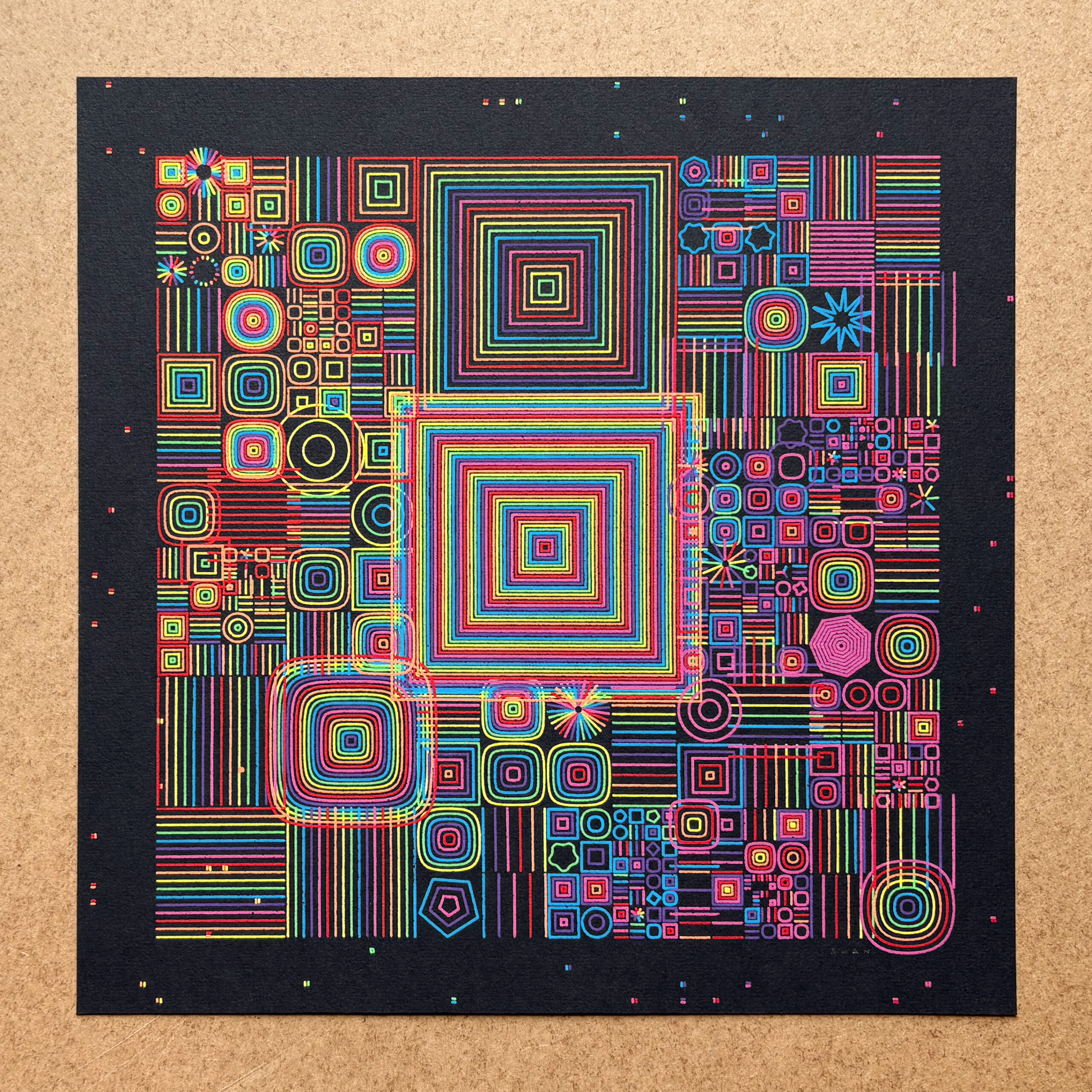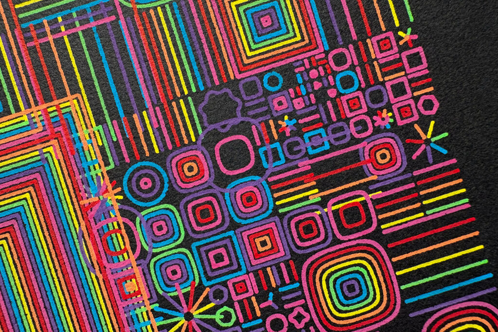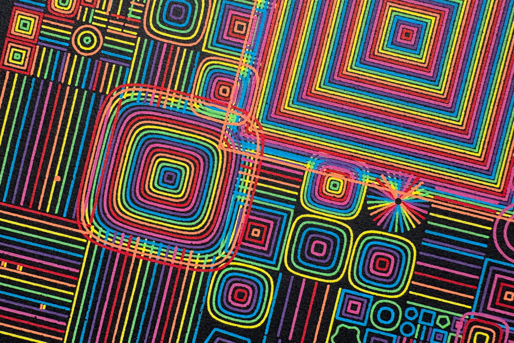One of my first series, based on a very simple recursion code. Inspired by the neon and vivid colors from fairs and Tokyo signs, Playground uses a wider spectrum of colors to convey a lot of energy, drawing from a wide bank of different shapes. Every color is a different layer to plot, therefore these pieces demand to change the plotter’s pen 7 times.