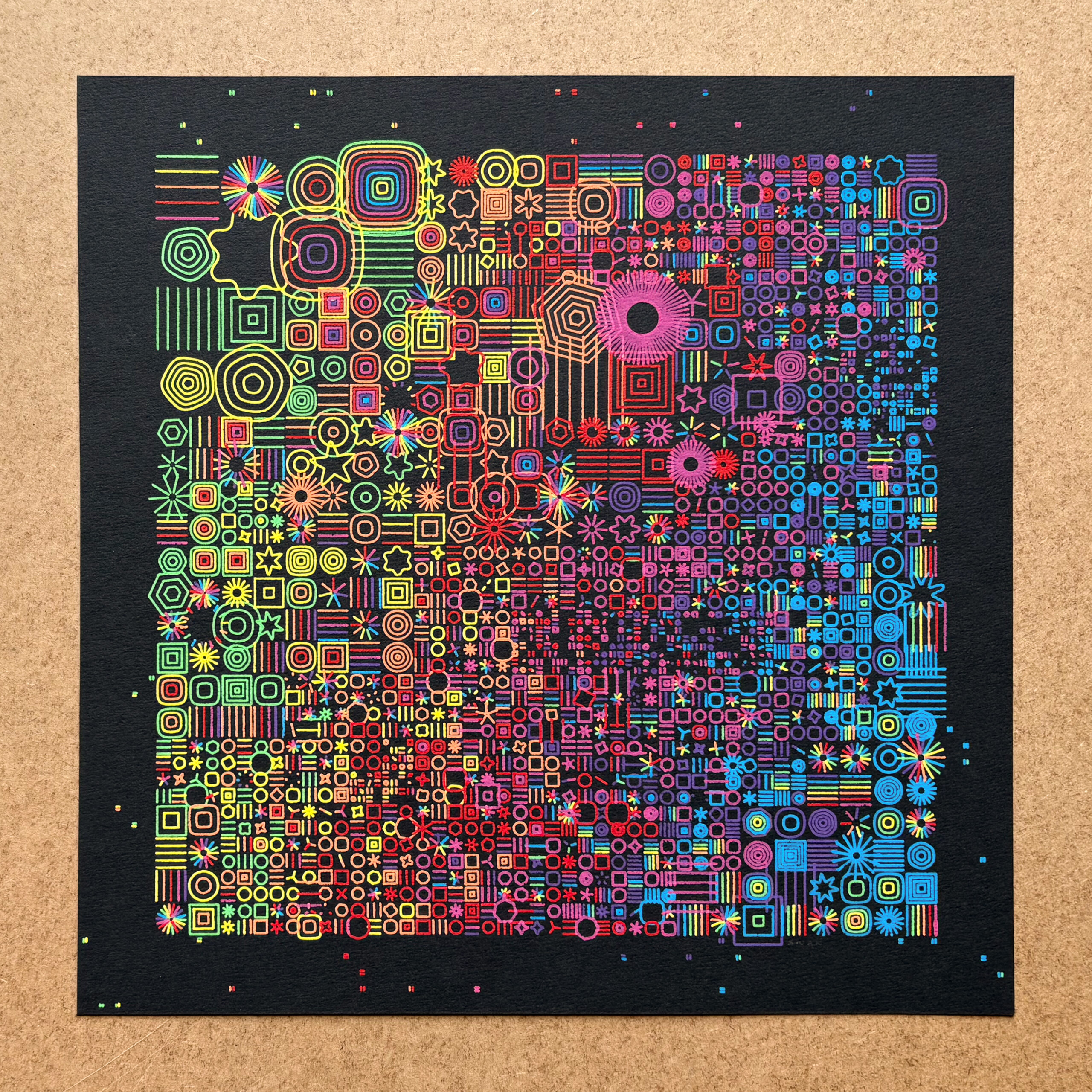 One of my first series, based on a very simple recursion code. Inspired by the neon and vivid colors from fairs and Tokyo signs, Playground uses a wider spectrum of colors to convey a lot of energy, drawing from a wide bank of different shapes. Every color is a different layer to plot, therefore these pieces demand to change the plotter’s pen 7 times.