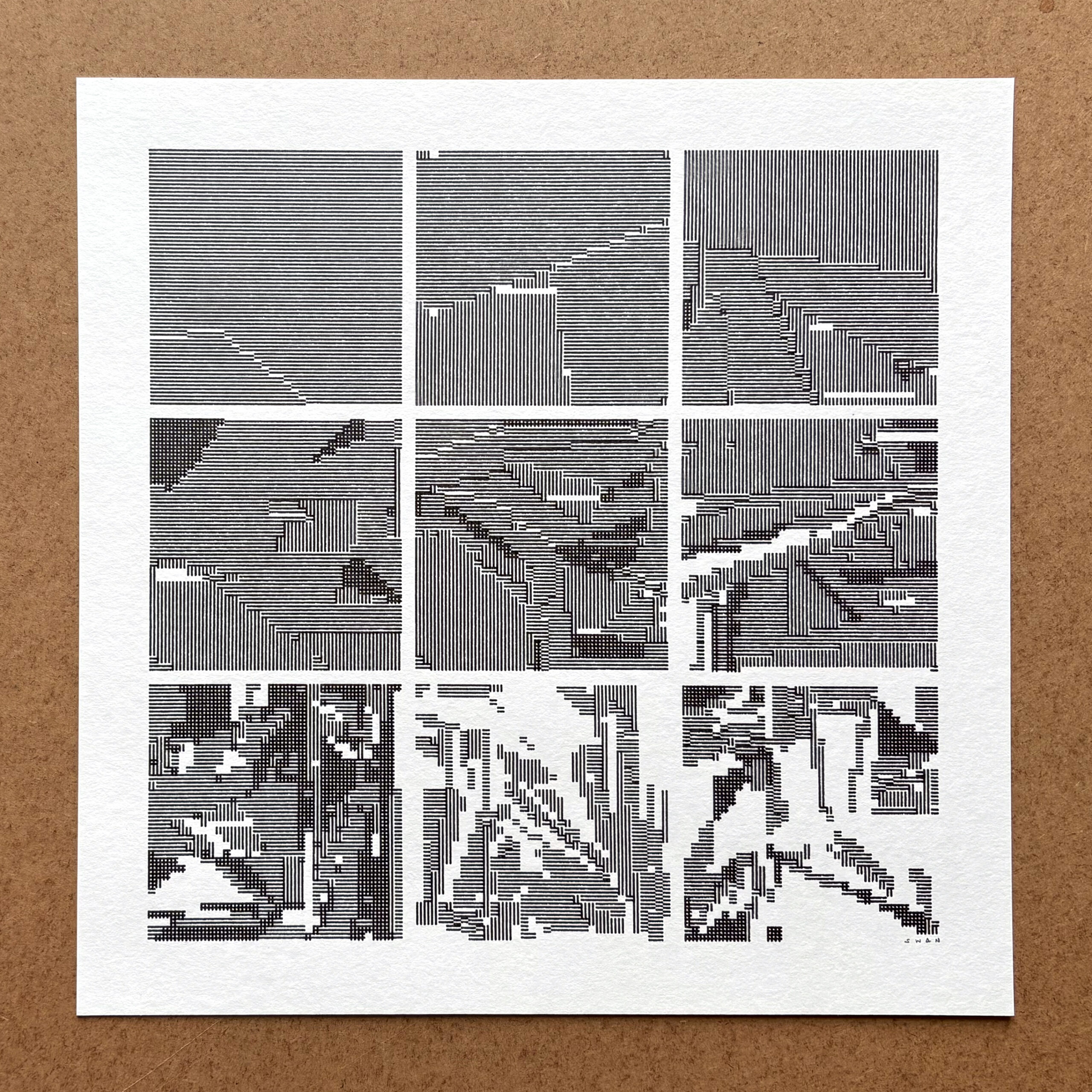 A violent unmaking of a rectangle, made of only parallel lines and dots.