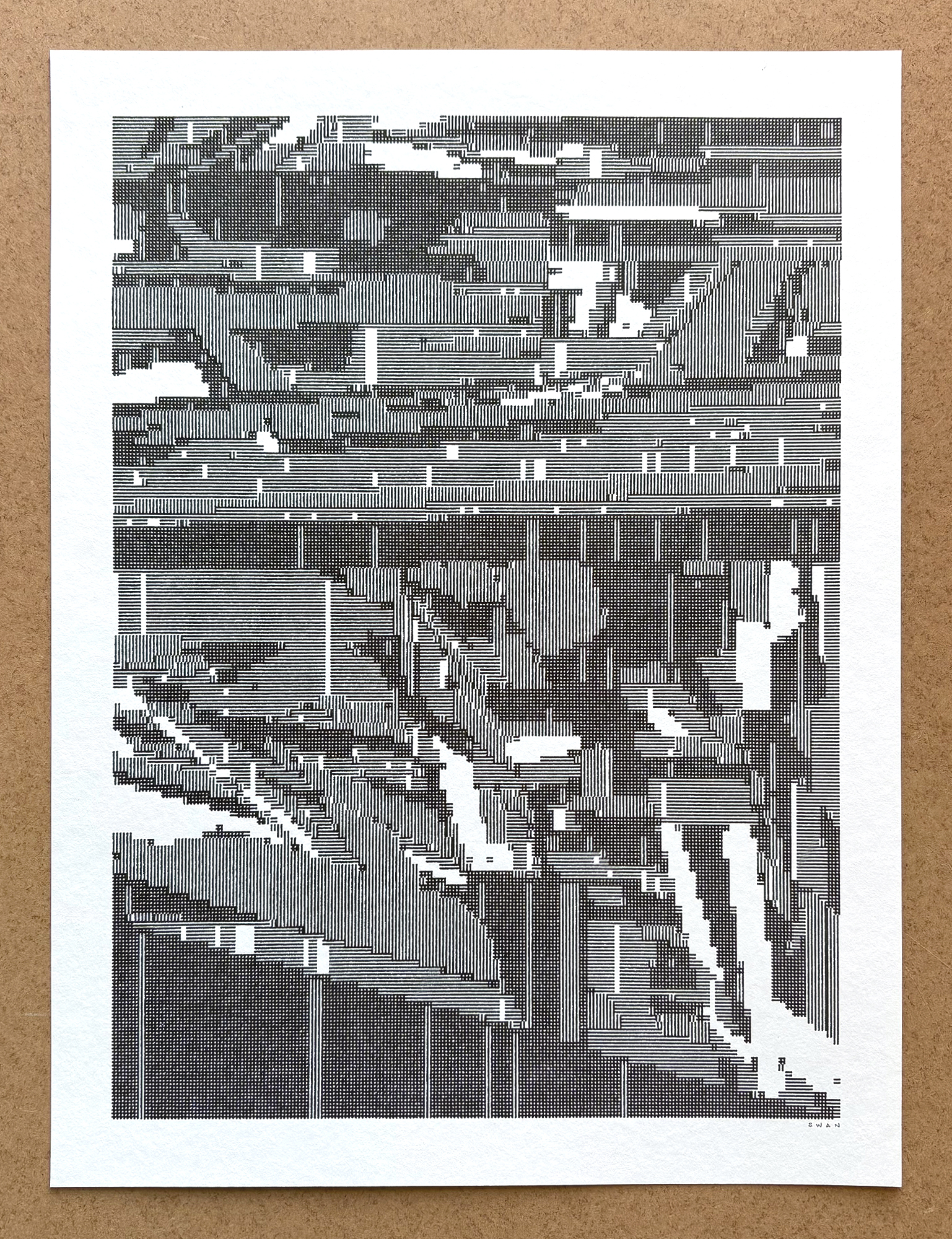 A violent unmaking of a rectangle, made of only parallel lines and dots.